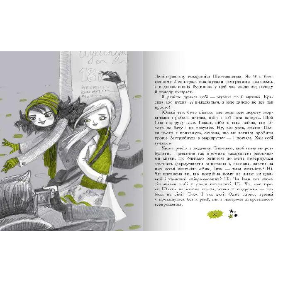 Самотня дівчинка йде по тротуару. Під парасолькою. Сама-саміська. Темненька така. І доріжка перед нею в потемку. І парасоля нічогенька — величезна. І на неї з неба сиплються квіти. Багато різних: ромашки, волошки, маки. Яскраві, красиві, живі. Сиплються, б’ються об чорну тканину і падають набік. Але квіти мають падати на голову, якщо вже хтось тебе ними обсипає, а не на парасольку!