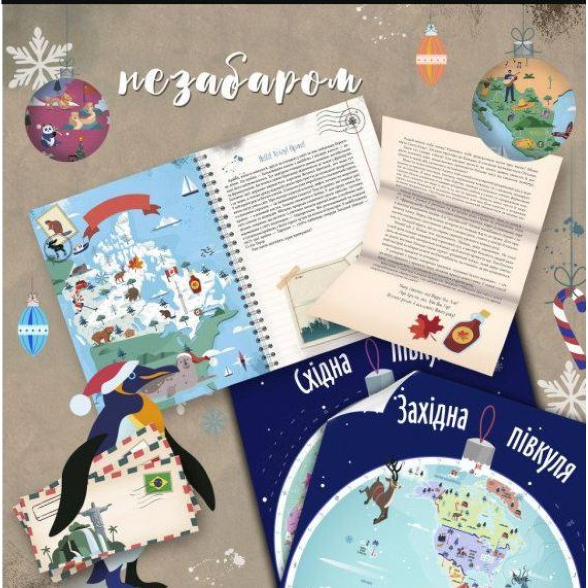 - карта світу, подана у вигляді Східної та Західної півкуль Землі — величезних ялинкових іграшок;