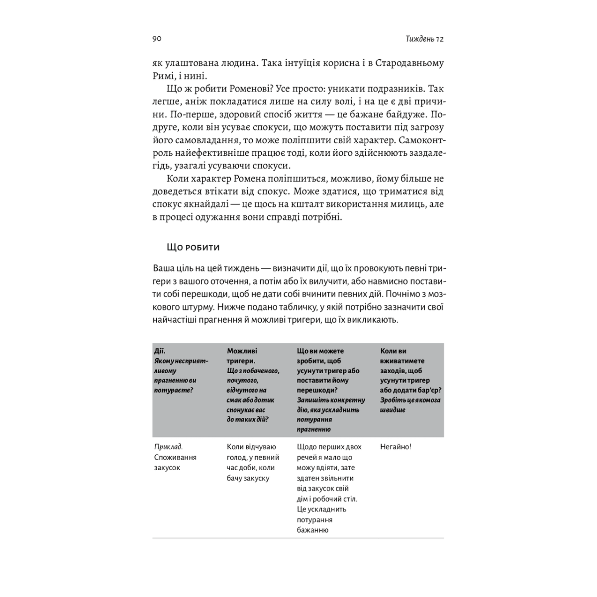У сучасному світі люди весь час кудись поспішають, живуть у постійному стресі та під тиском дедлайнів. Ця книжка — справжній практичний посібник зі змін свого життя на краще, розрахований на цілий рік (52 тижні). Вона не просто пояснює принципи стоїцизму, а ще й дає конкретні вправи, які допоможуть звільнитися від тягаря психологічної напруги, усвідомити внутрішню силу та почати насолоджуватися моментом. Це книжка, створена не для читання, а для дій.