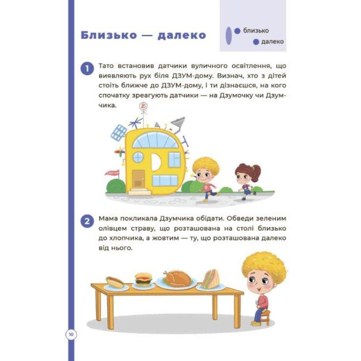 Маленьким Дзумчику та Дзумочці відповідно 6 та 5 років, і вони готуються до школи. Щоб полегшити їхнє майбутнє навчання, необхідно разом з ними потренуватися у розв’язанні логічних завдань! Що будемо робити? • Зіставляти предмети за кольором, розміром, матеріалом. • Сортувати предмети за призначенням та характеристиками. • Проходити лабіринти. • Шукати закономірності. • Розшифровувати закодовану інформацію.