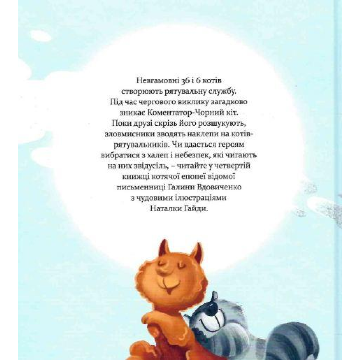 Під час чергового виклику загадково зникає Коментатор-Чорний кіт. Поки друзі скрізь його розшукують, у місті розгортається кампанія з дискредитації котів-рятувальників. Чи вдасться котам вибратися з халеп і небезпек, які на них чигають звідусіль, – читайте у цікавій і динамічній історії з чудовими ілюстраціями Наталки Гайди.