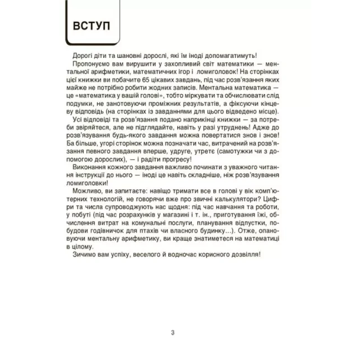 На сторінках цієї книжки ви побачите 65 цікавих завдань, під час виконання яких майже не потрібно робити жодних записів. Міркувати та обчислювати слід подумки, не занотовуючи проміжних результатів, а запам’ятовуючи їх. Можливо, ви запитаєте: навіщо тримати все в голові, у вік комп’ютерних технологій? Цифри та числа супроводжують нас усюди: під час навчання та роботи, у побуті, під час розрахунків за покупки, приготування їжі тощо. Тож уміння обчислювати подумки — корисна навичка на щодень!