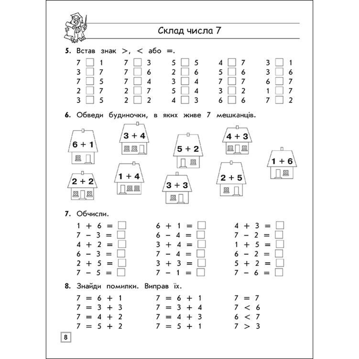 Перші завдання присвячені знайомству з поняттям складу числа на предметах. Дитині пропонується порахувати і розфарбувати предмети, які демонструють, на які складові можна розкласти число. Наступне завдання показує склад числа як суму окремих чисел. Далі представлені завдання на відпрацювання навичок, запам“ятовування і вміння використовувати знання на практиці. У посібнику пропонуються приклади, в яких необхідно обчислити кінцевий результат, вставити відсутній доданок, порівняти числа між собою. Для тренування уважності передбачені завдання «Знайди помилку» Якщо ви ставите питанням: «як навчити дитину рахувати?», то тренажер з математики стане хорошим помічником в освоєнні даної теми. Для чисел від 2 до 5 завдання представлені на одній сторінці, для 6,7 і 8 - на двох. Склад чисел 9 і 10 займає по три сторінки.