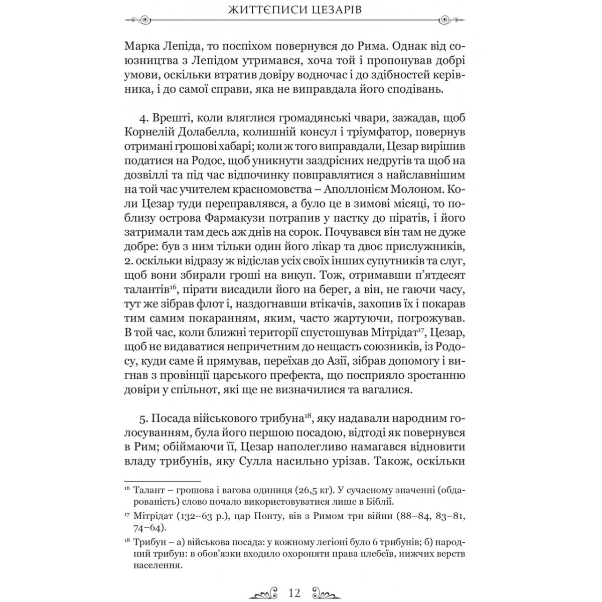 У книзі відомого римського історика Ґая Светонія подано життєписи римських цезарів. Поряд із прикладами мужності, відваги та чесності читач стане свідком неймовірної жорстокості, розпусти, свавілля та жадібності; це, як не дивно, поєднувалося з високими моральними якостями як в окремих особах, так і в римській культурі загалом.