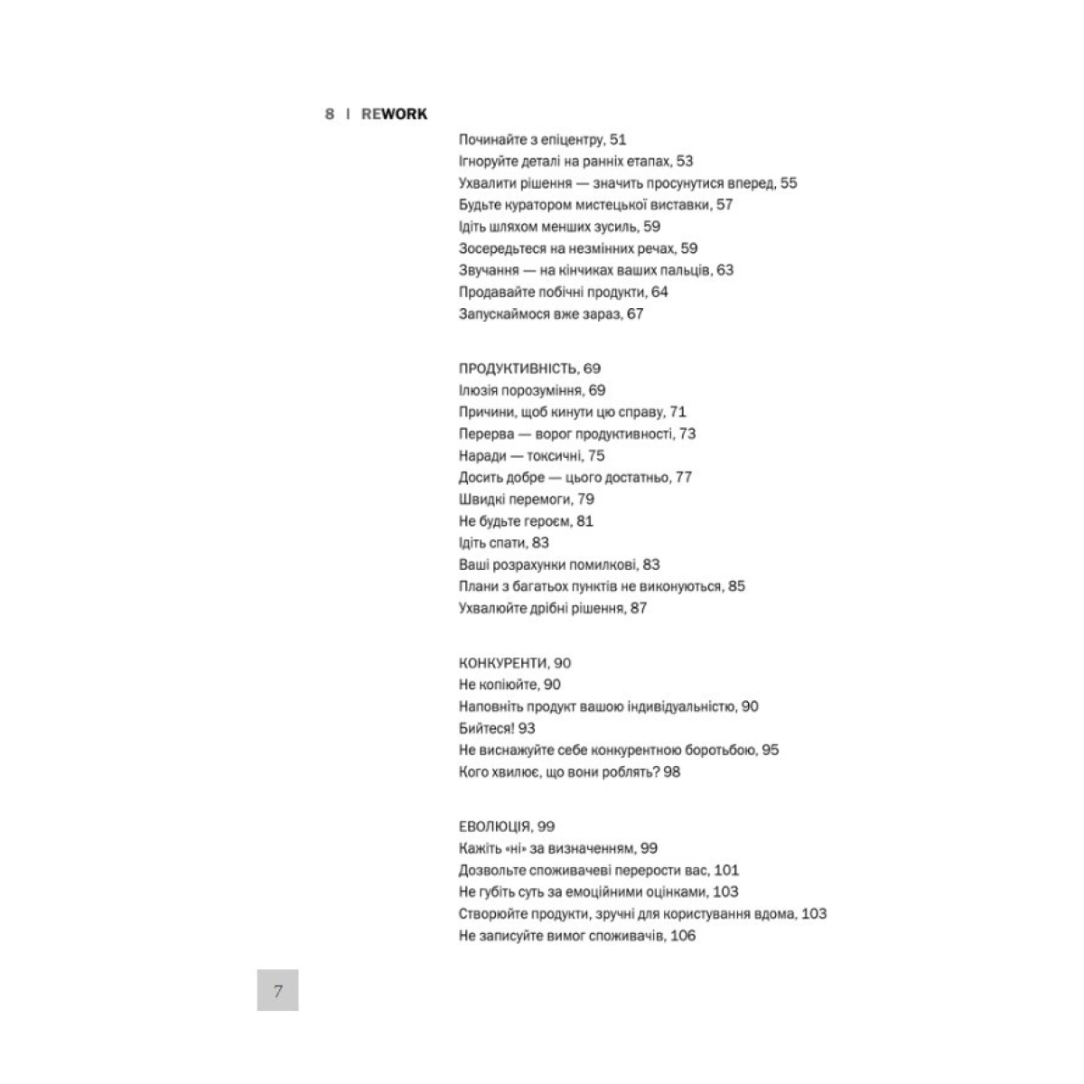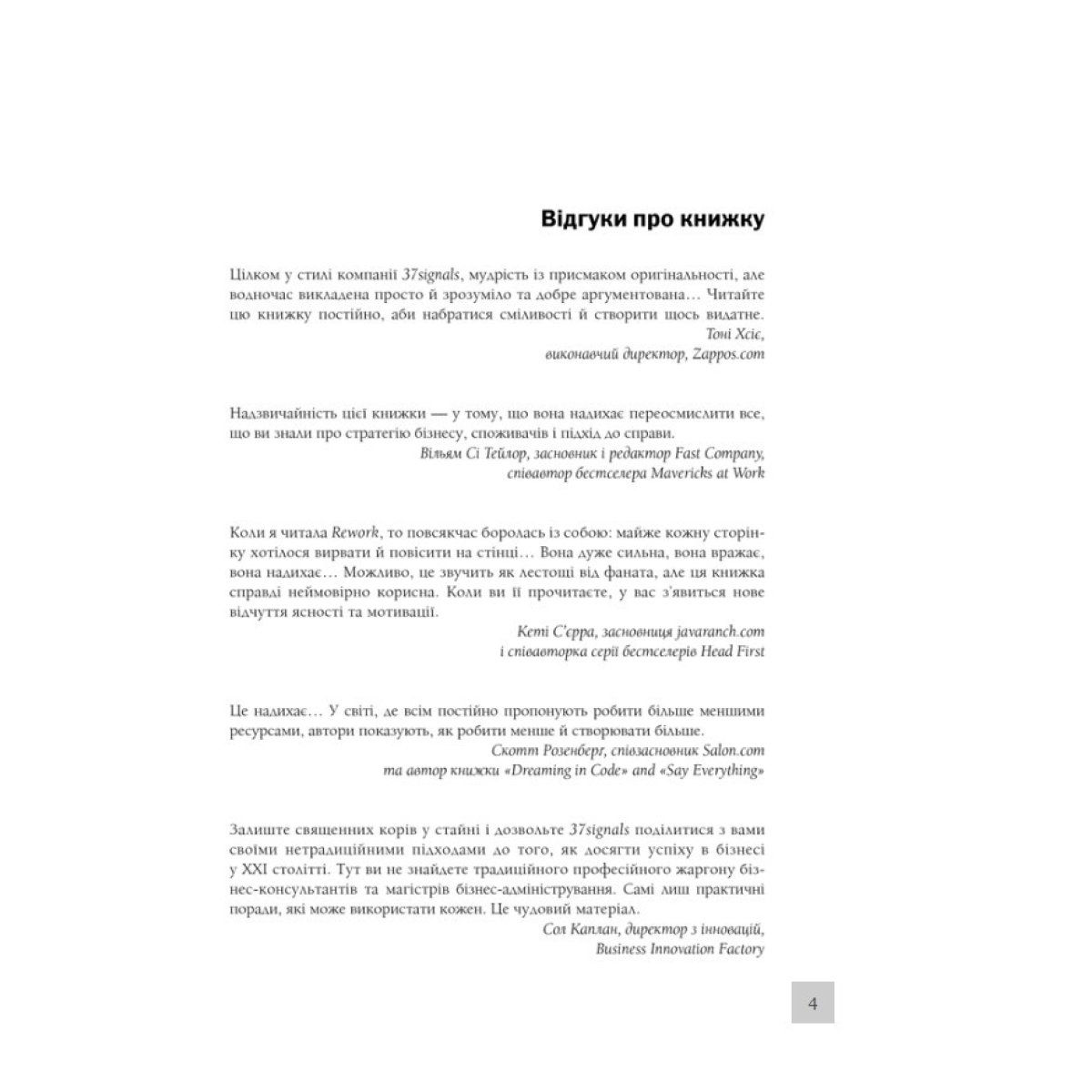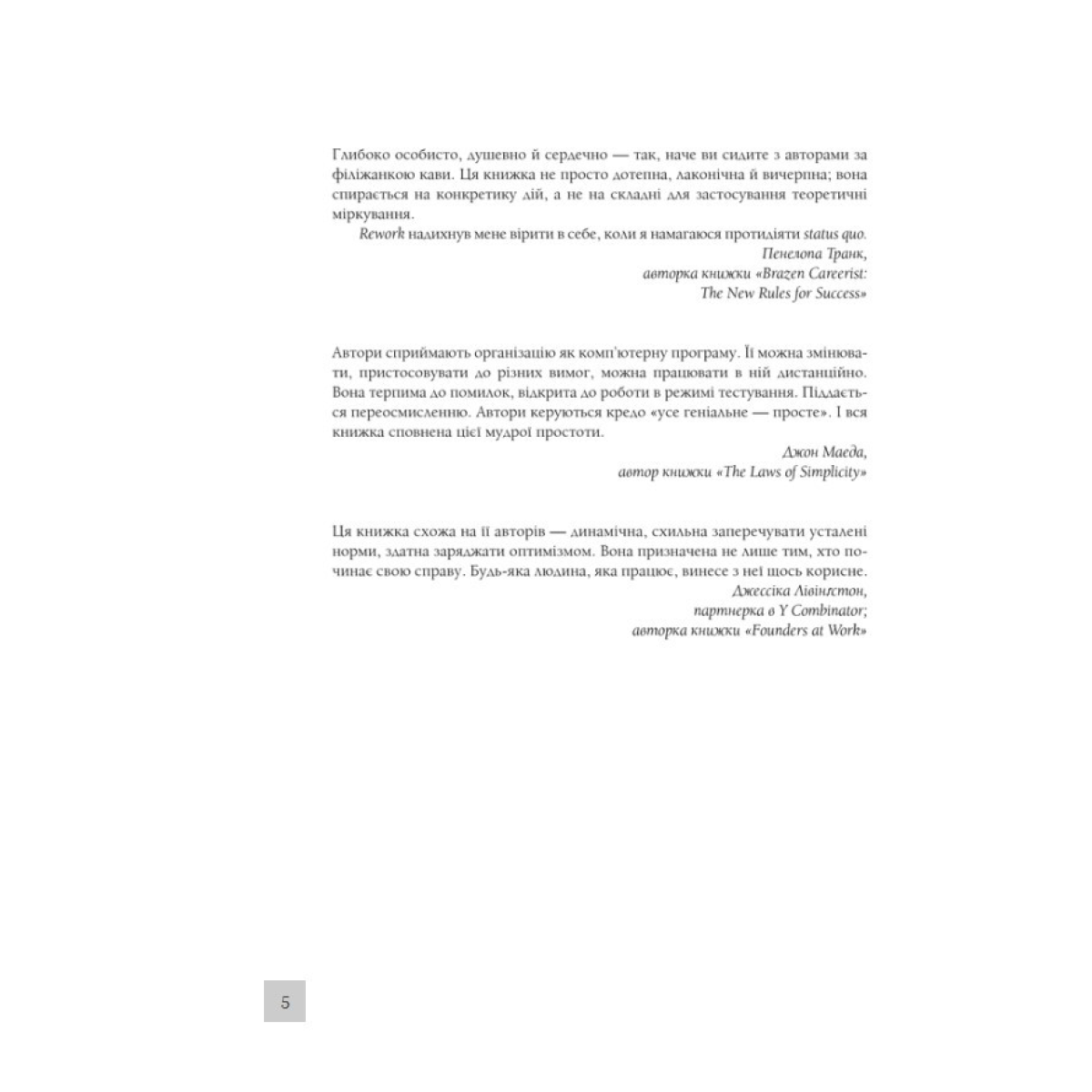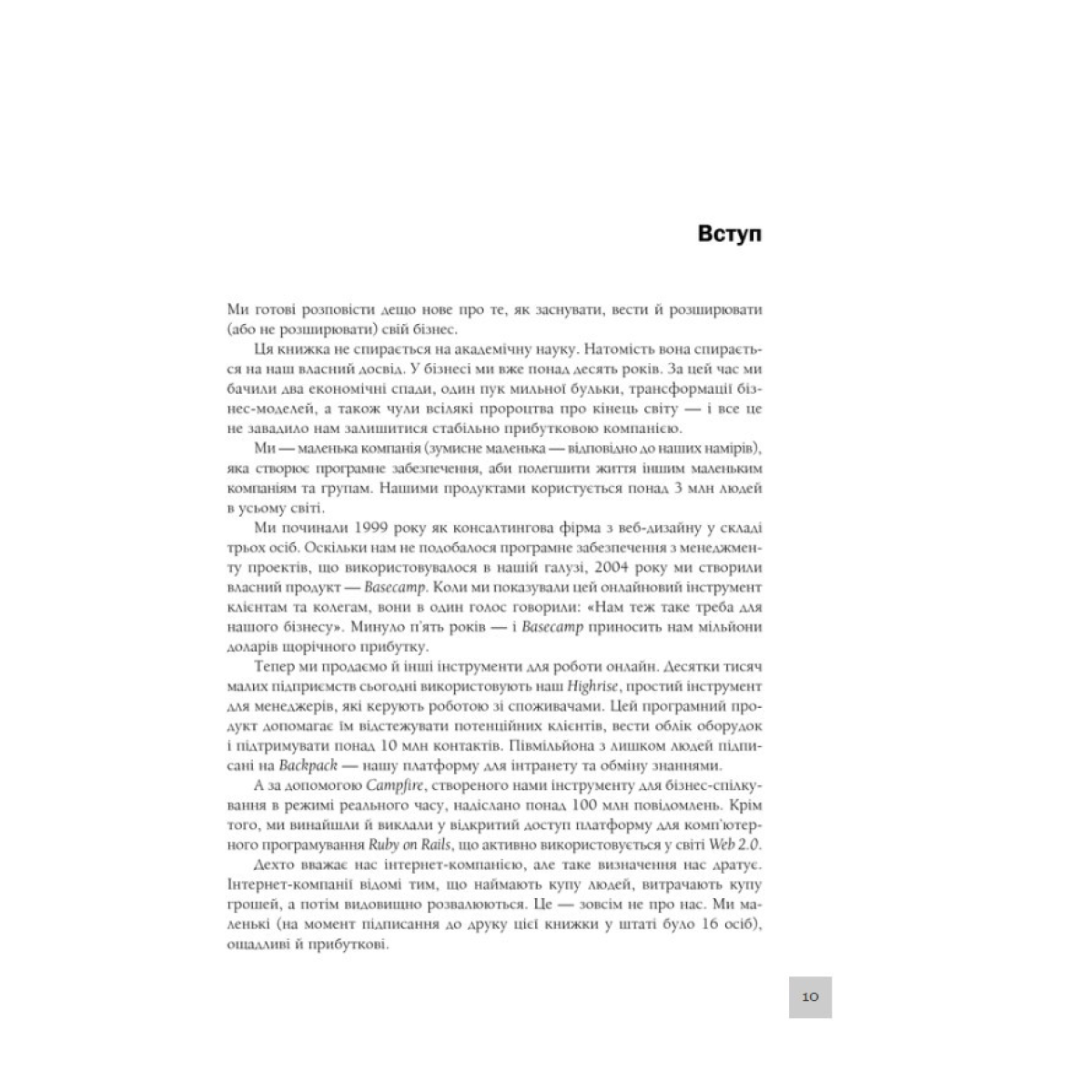Автори крок за кроком навчать вас, як почати справу, пояснять, чому вам треба менше, ніж ви думаєте, порадять, як зробити так, щоб про вас дізналися, порекомендують, кого і коли варто взяти на роботу, а також як з усім цим упоратися.
