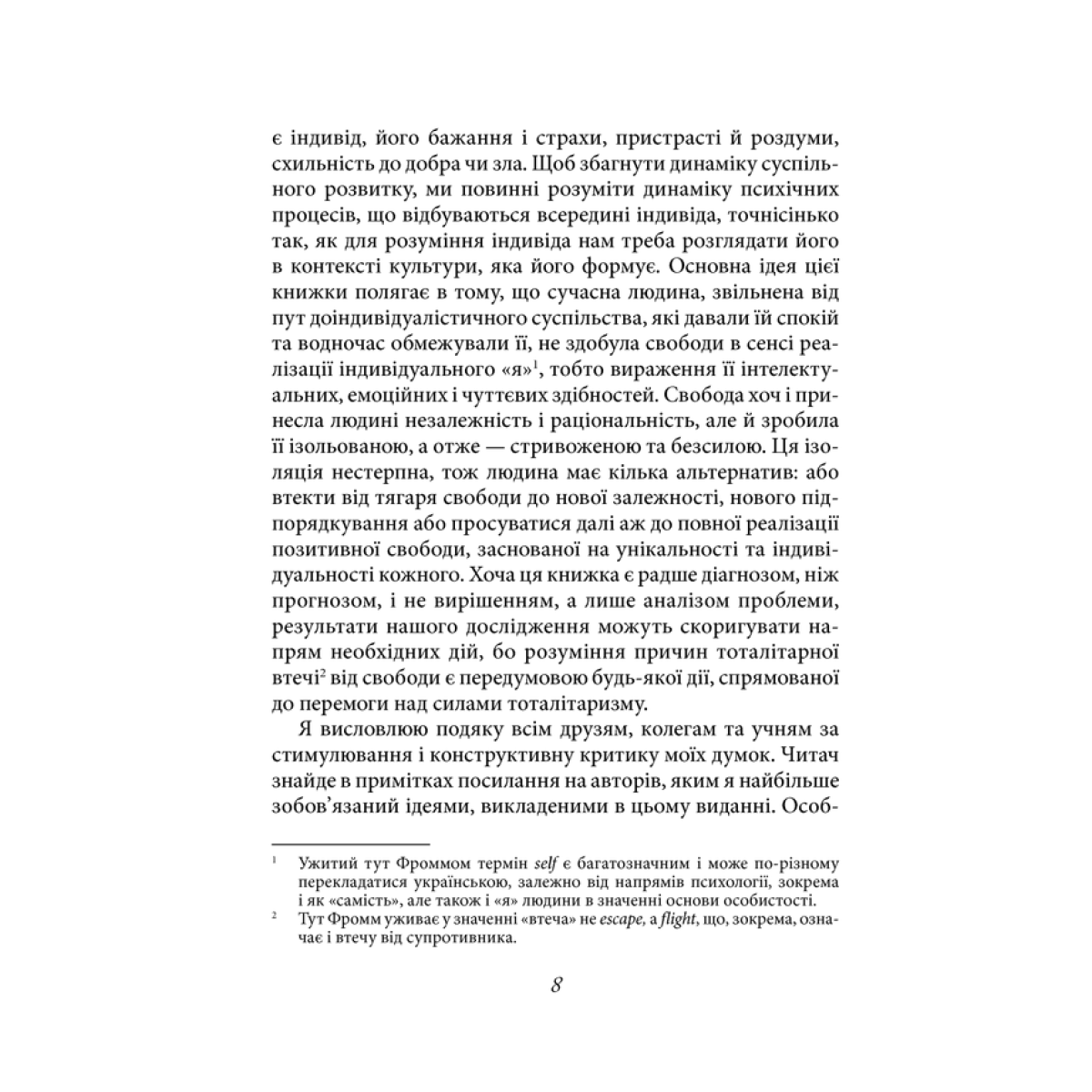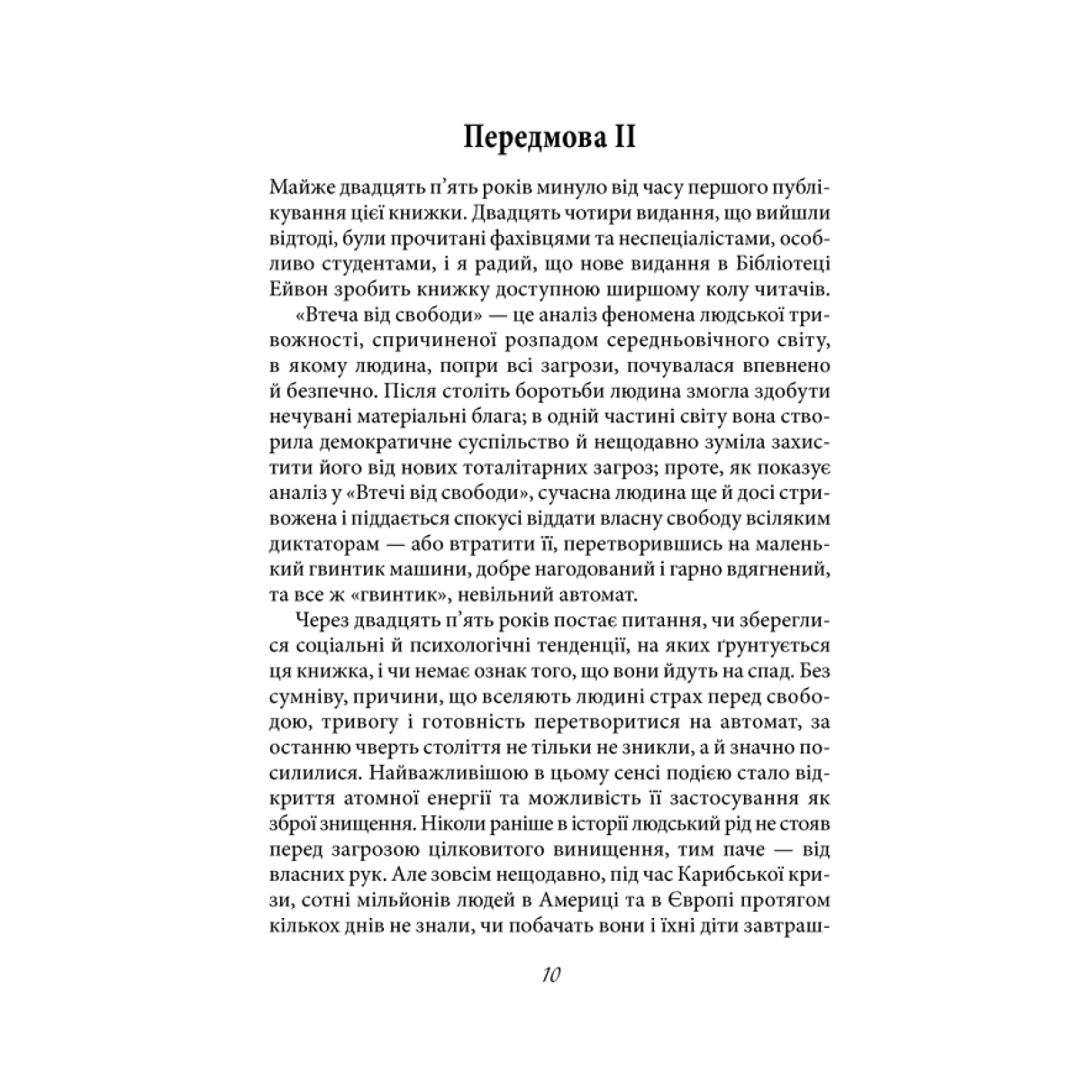 Еріх Фромм — видатний німецький філософ і психоаналітик, один із засновників неофройдизму, автор книжки «Мистецтво любові» та ще низки праць, які вважаються класичними у психології. Основоположник психоаналізу Зиґмунд Фройд говорив: «Більшість людей насправді не хочуть свободи, тому що вона передбачає відповідальність, а відповідальність лякає людей». Може, тому втеча від свободи цілком прийнятна для більшості?