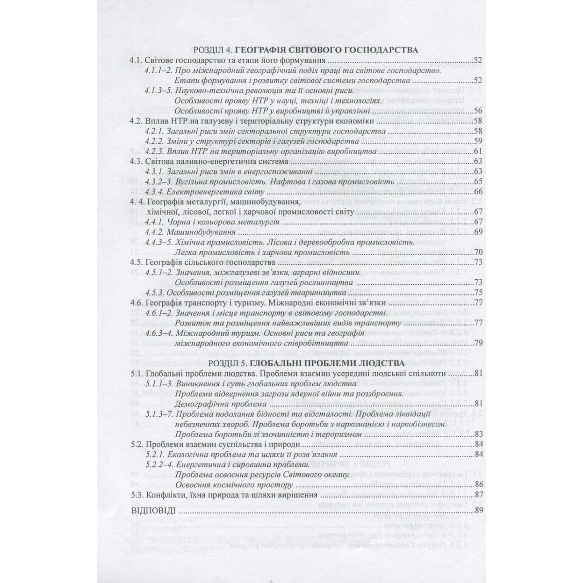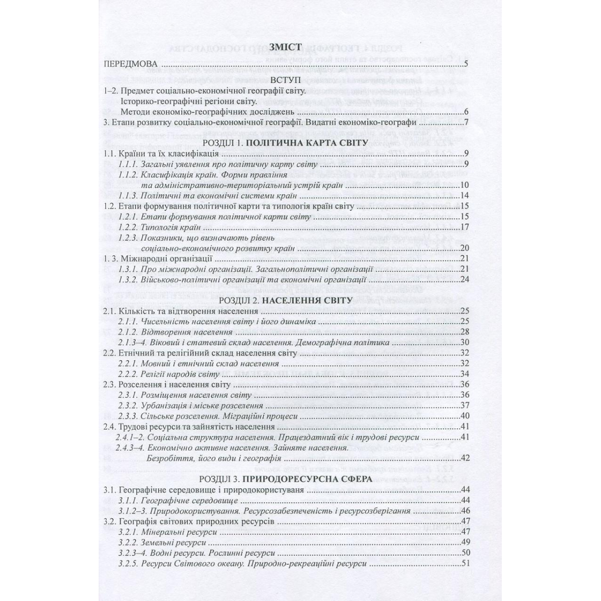 Посібник складається з п’яти розділів, які поділено на підрозділи, а ті, своєю чергою, на теми. За структурою і змістом вони повністю відповідають посібникові Й. Р. Гілецького та Р. Р. Сливки “Соціально-економічна географія світу: навчальні матеріали” (Тернопіль : Мандрівець, 2016).