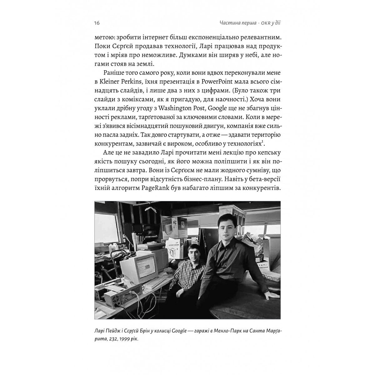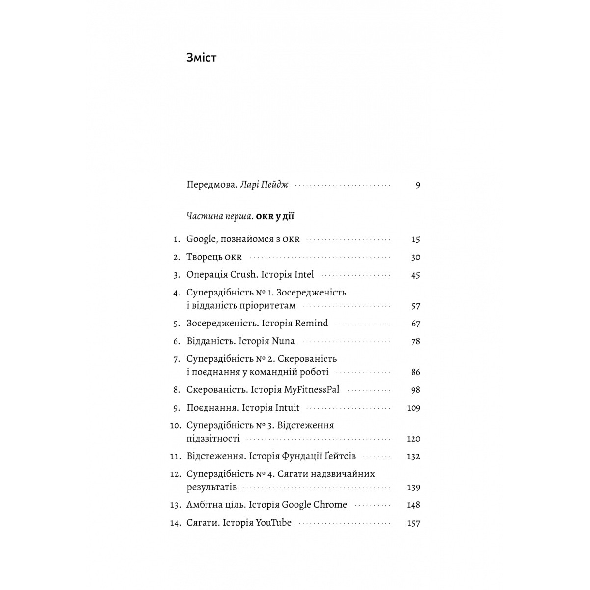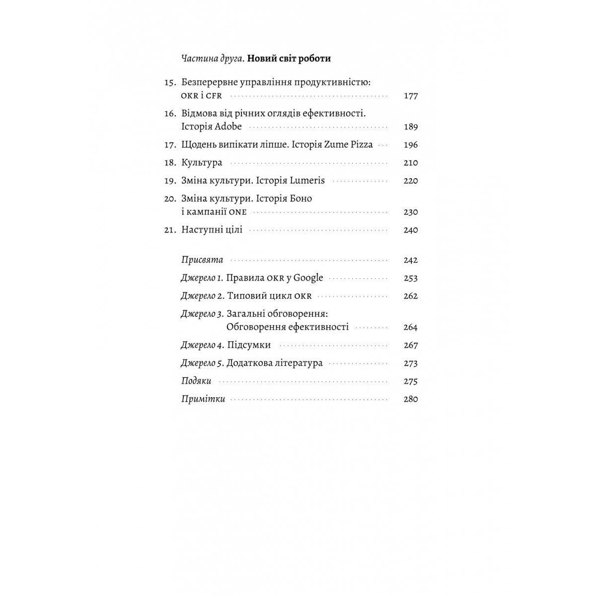 Все залежить від втілення. Джон Дор, один із перших «гаражних» інвесторів Google, зробив цікавий сплав прикладної бізнеслітератури та реальних історій становлення бізнесу і громадських організацій. З досвіду Google, інноваційної піцерії Zume, благодійної кампанії лідера групи U2 Боно і фундації Ґейтсів — а до всіх цих ініціатив Дор мав персональний стосунок — він виснував окремий метод об’єктивного вимірювання цілей і результатів під назвою okr, objectives and key results.