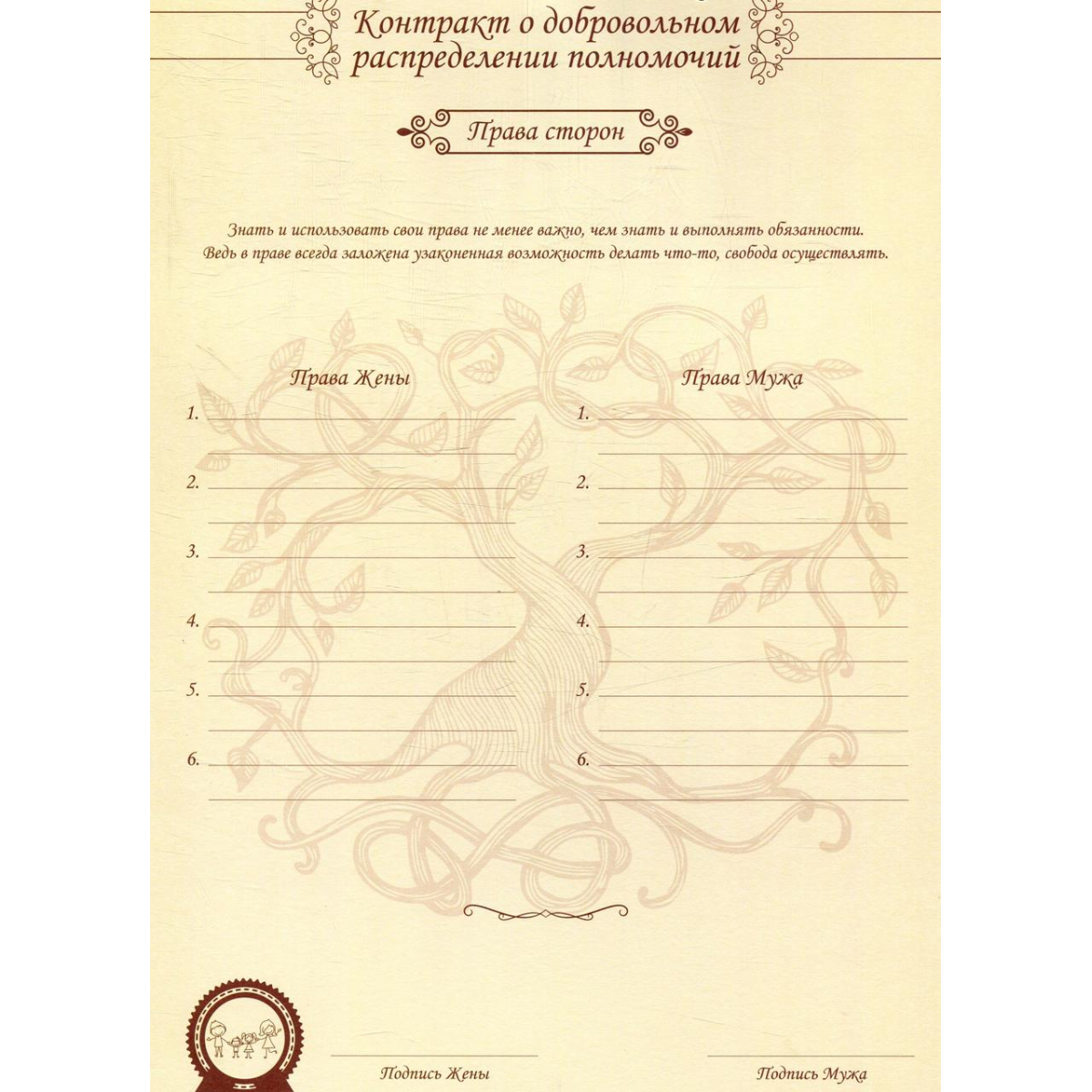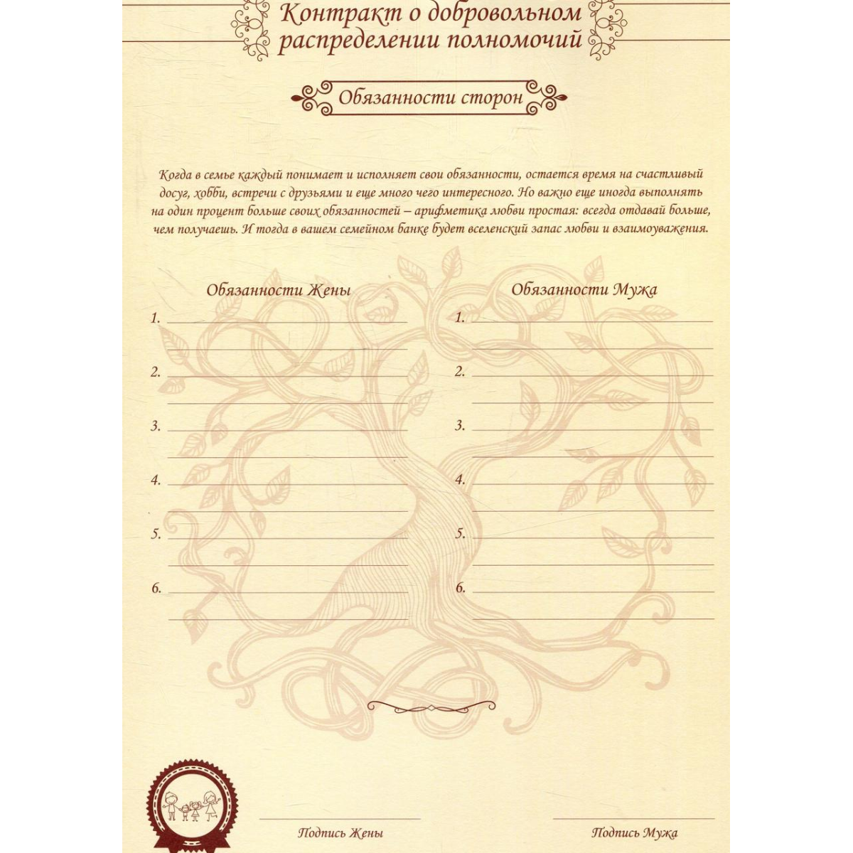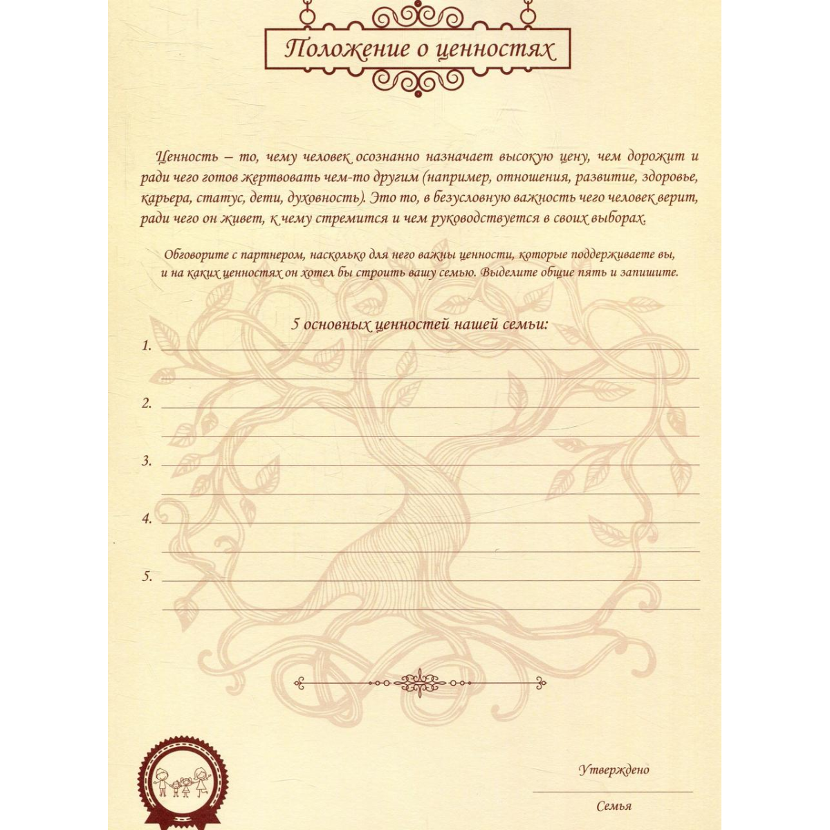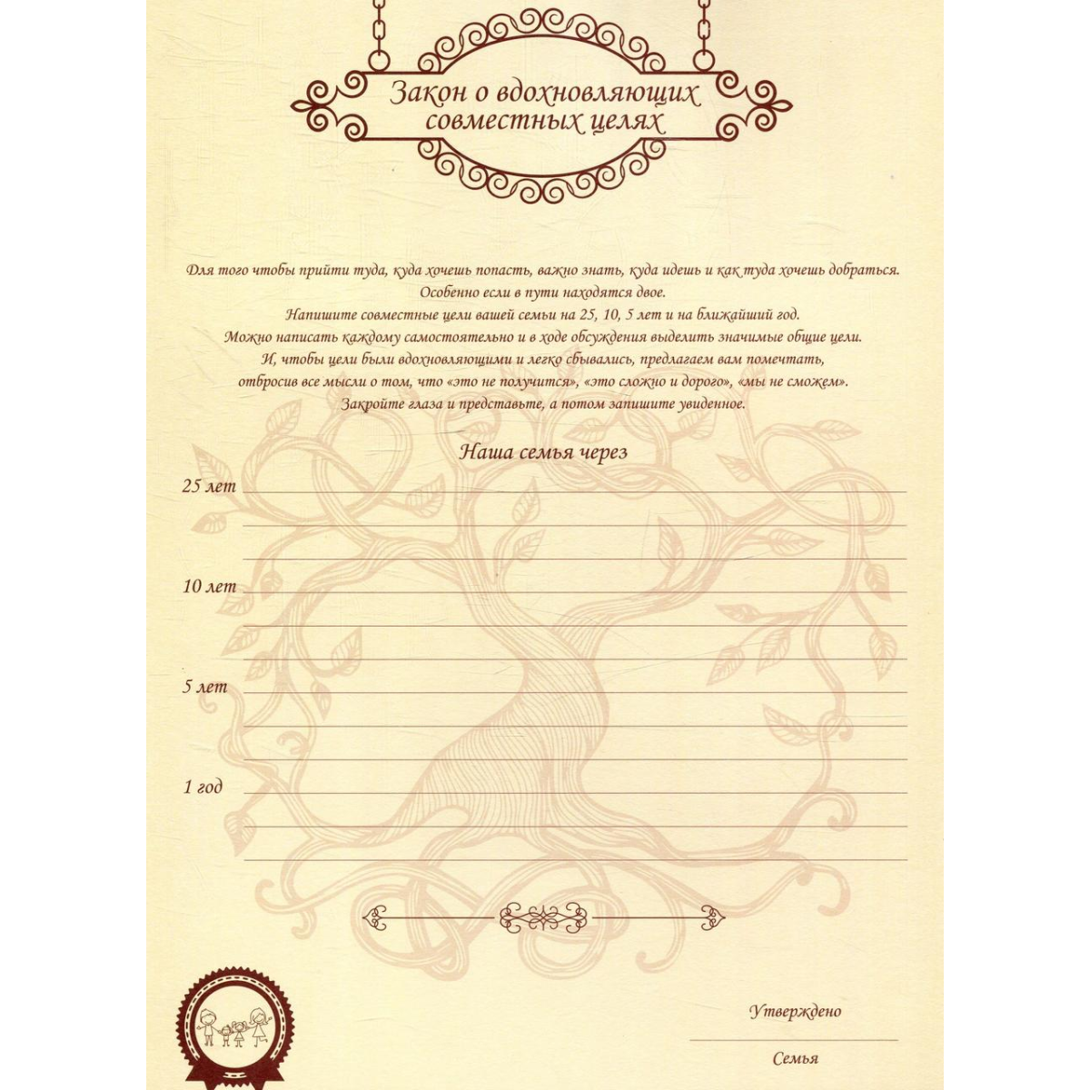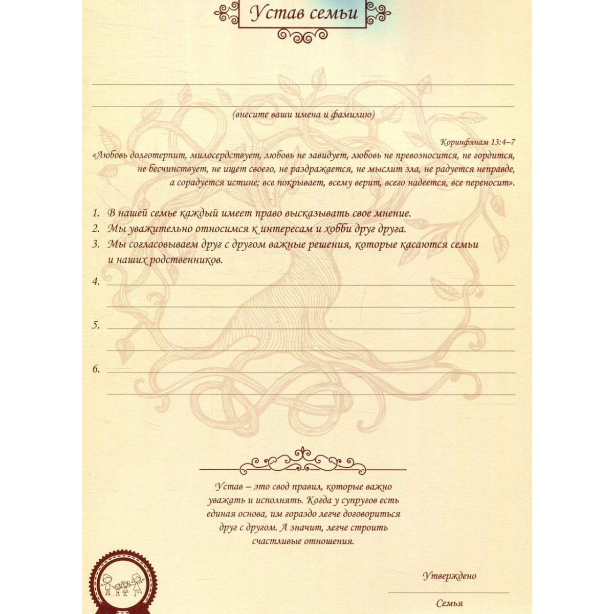 Щоб уникнути можливих скандалів в майбутньому, важливо сформулювати чіткі правила й цінності сім'ї. Психологи кажуть, що це один з кращих прийомів формування позитивних відносин в будь-якому колективі (сім'я, це теж колектив). Але тільки сформулювати недостатньо. Їх потрібно записати і затвердити. "Неформальні сімейні закони для щасливого життя" - унікальний інструмент створення в родині атмосфери довіри, поваги та любові один до одного.
