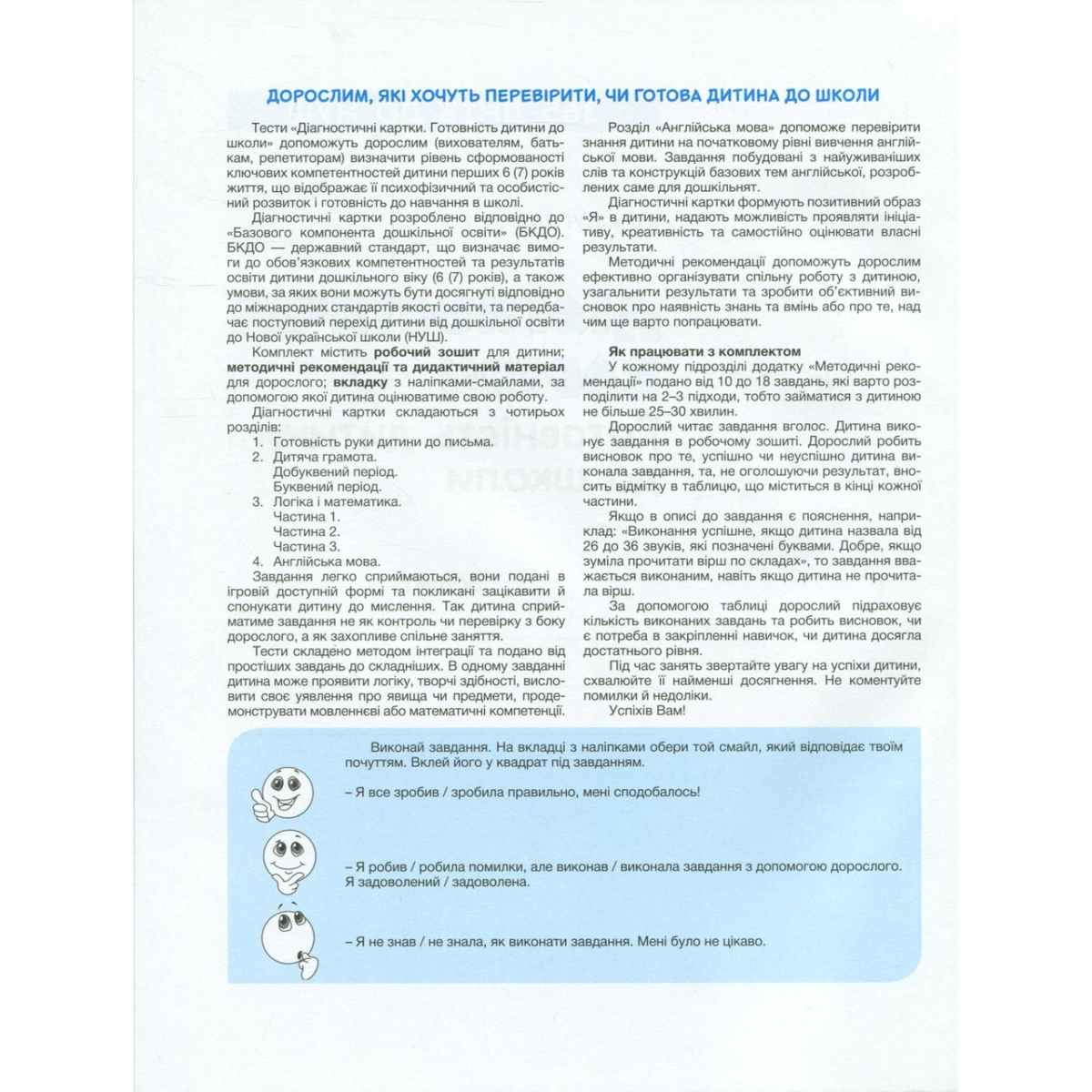 Тести «Діагностичні картки. Готовність дитини до школи» допоможуть дорослим (вихователям, батькам, репетиторам) визначити рівень сформованості ключових компетентностей дитини перших 6 (7) років життя, що відображає її психофізичний та особистісний розвиток і готовність до навчання в школі.