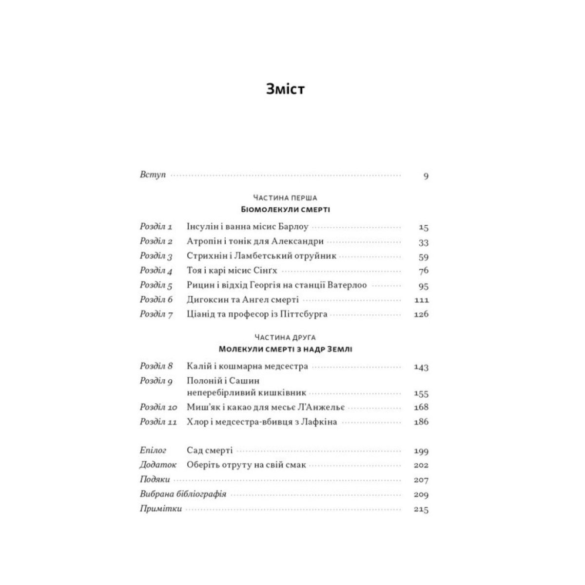 Читач знайомиться з історіями знаменитих убивств, що сталися через ці токсини. В одному розділі описується, як шпалери в спальній кімнаті Наполеона були покриті миш’яком, що могло стати причиною його смерті. В іншому — як звичайний джин-тонік став шляхом до усунення противника.