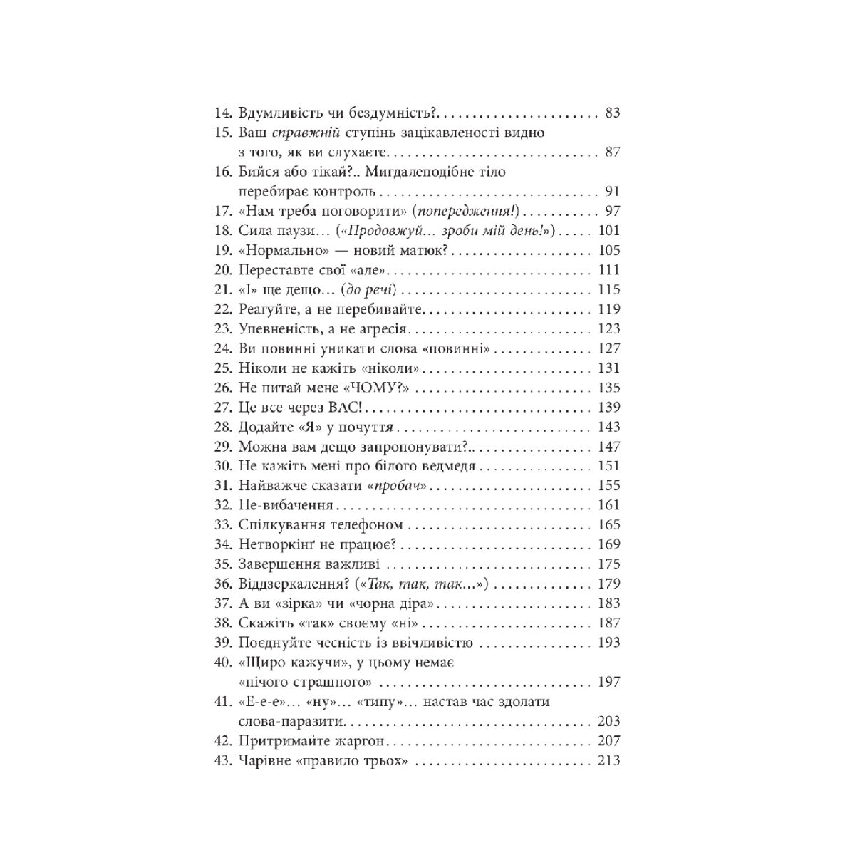 Сучасна залежність людей від месенджерів негативно впливає на навички живої комунікації. Слова мають силу як лікувати, так і шкодити, тож завжди варто стежити за своїми формулюваннями. Книга має на меті допомогти читачам опанувати мистецтво говорити й навчитися миттєво обмірковувати, що і як сказати. Автор аналізує роботу слів, позначає типові пастки, яких слід уникати, та надає безліч простих, але потужних способів покращити вербальні навички та щоденну взаємодію. Він зазначає, що для ефективного спілкування важлива не тільки мова, а й інтонація, вираз обличчя, гучність голосу, поза тіла тощо. Вміння й сміливість говорити допоможе розв'язати безліч проблем у робочих і особистих стосунках і позбутися думок, як краще було б відповісти у тій чи іншій ситуації.